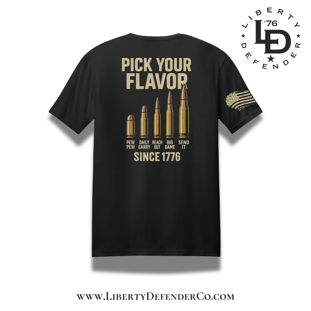 The Pick Your Flavor Tee is a patriotic graphic t shirt designed for Americans who respect skill, responsibility and the freedom protected since 1776. This men’s patriotic shirt features detailed caliber artwork, a distressed flag sleeve print and a bold message that speaks to range lovers, veterans and everyday defenders of the Second Amendment.